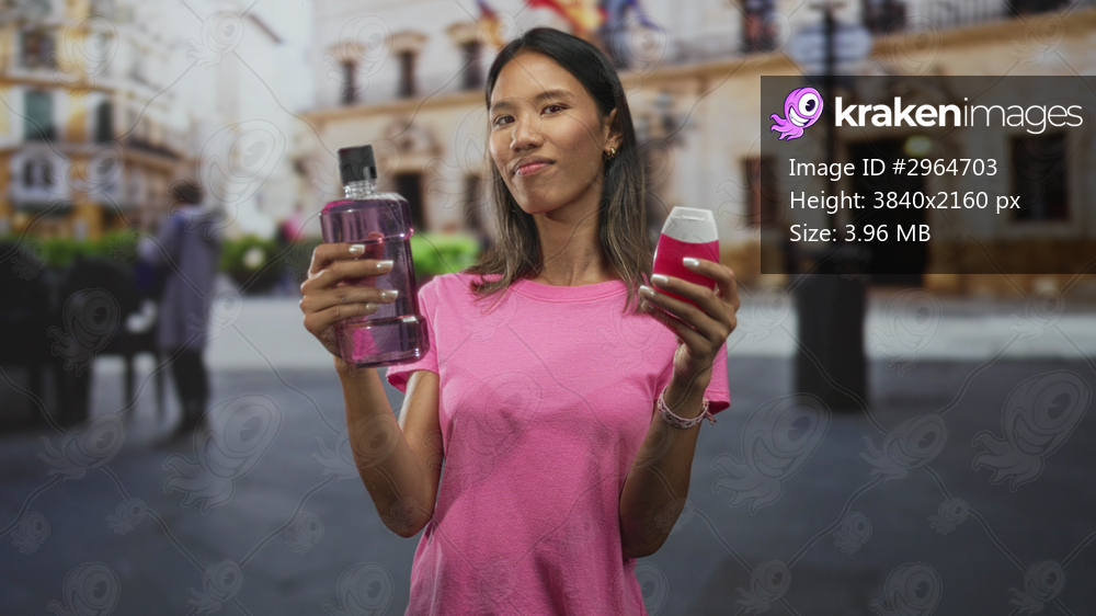 Thai woman holds mouthwash bottle and toothpaste in hands, smiling and presenting products in front of a historic building plaza; oral care wellness cheerful. - Kraken Images