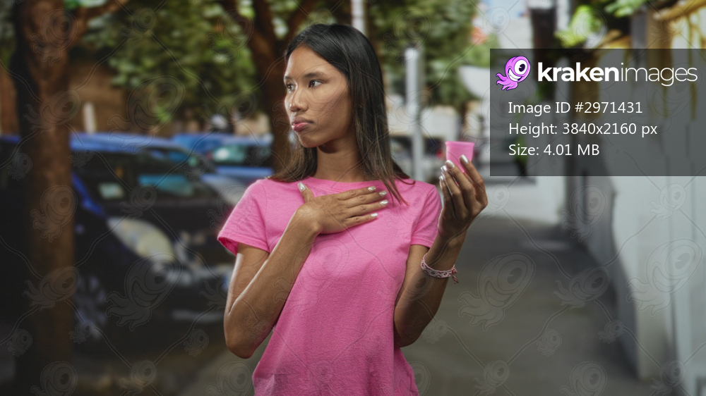 Thai woman holds pink menstrual cup in one hand and places other hand to chest on a narrow urban street with parked cars; hesitation curiosity.