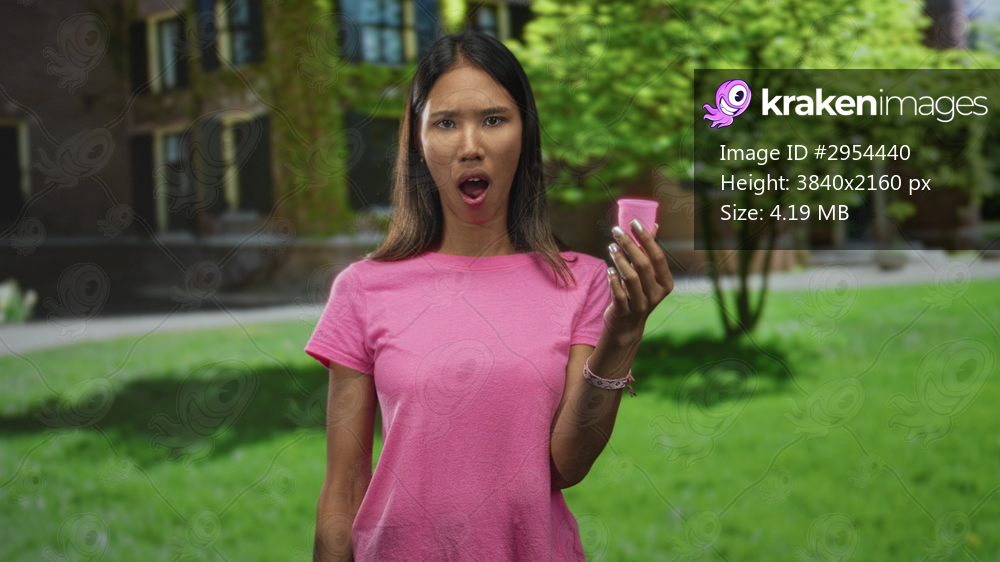 Thai woman holds pink menstrual cup with right hand, left hand on chest and grimace while standing on green lawn in front of building; disgust concern. - Kraken Images