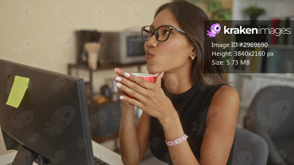 Thai woman holds red mug with both hands at an office desk while looking at computer monitor and bookshelf, wearing glasses and sleeveless top; calm break. - Kraken Images