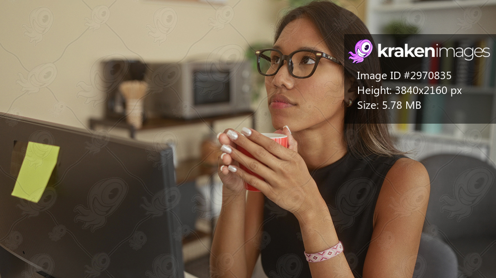 Thai woman holds red mug with both hands at an office desk while looking at computer monitor and bookshelf, wearing glasses and sleeveless top; calm break. - Kraken Images