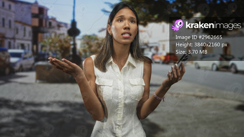 Thai woman holds smartphone in hand, gesturing with open palm on a street; frustration communication.