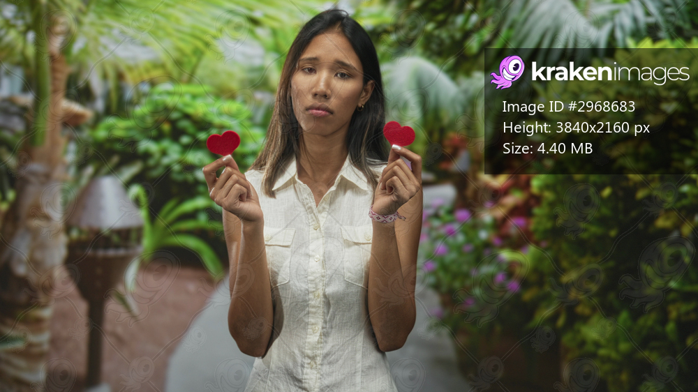 Thai woman holds two red felt hearts with raised hands showing a pout and sad expression on a tropical forest path; heartbreak longing.