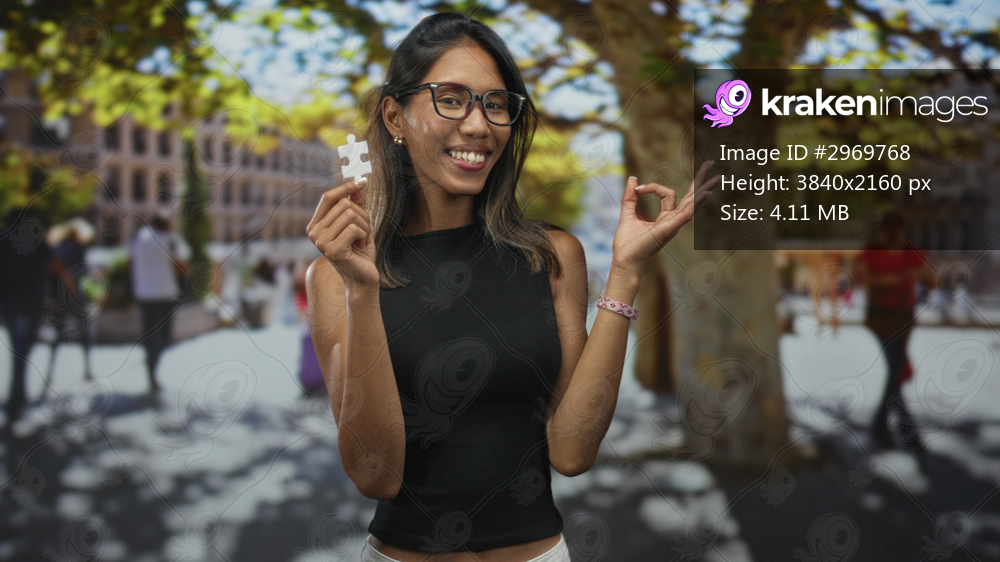 Thai woman in black sleeveless top holding a white puzzle piece, making ok sign with her hand and smiling in front of a tree lined building on a sunlit street; serenity. - Kraken Images