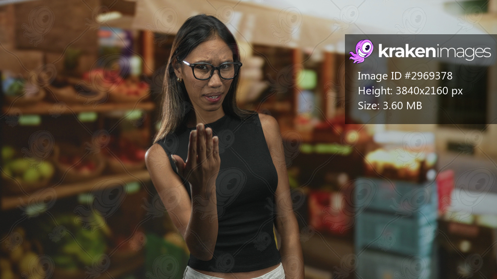 Thai woman in glasses beckoning with one hand at a street fruit stall, visible palm up gesture; skepticism.