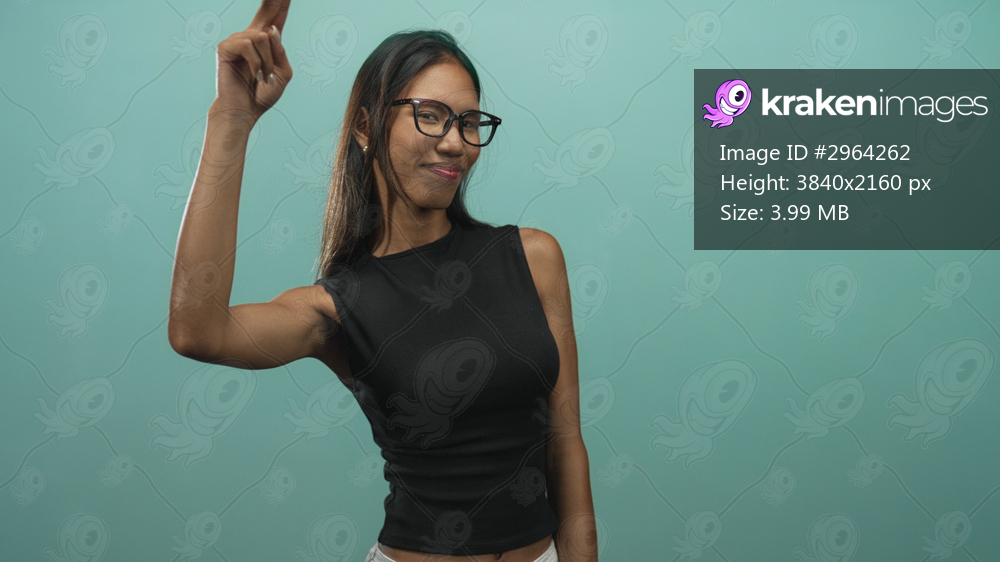 Thai woman in glasses points finger to head while winking, wearing black sleeveless top in studio; playful confidence.