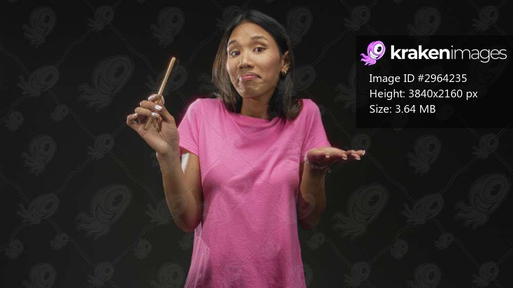 Thai woman in pink tee holding bamboo toothbrush with palm up presenting in studio; cheerful oral hygiene.