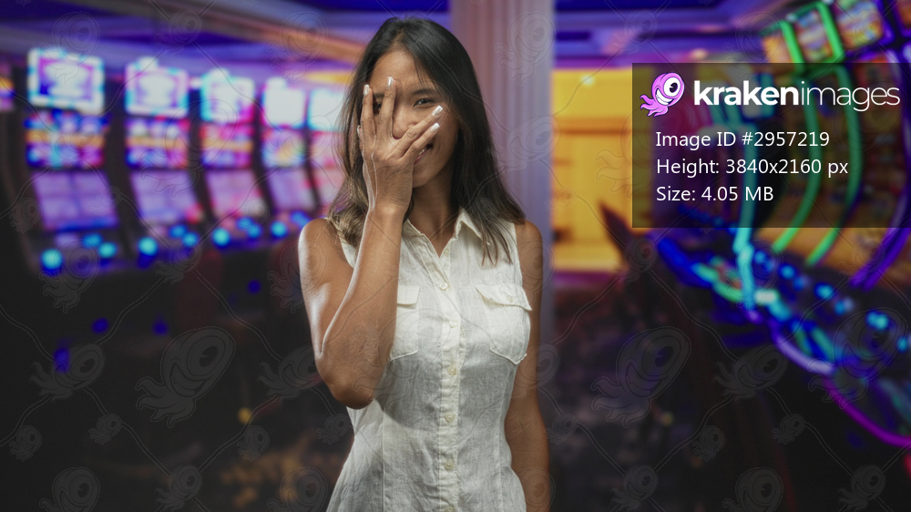 Thai woman in sleeveless white shirt covers face with hand while smiling at neon slot machines in a casino building; playful leisure.