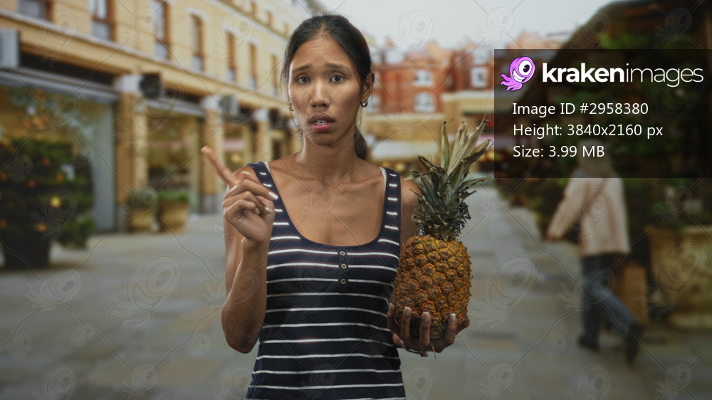 Thai woman in striped sleeveless top holds pineapple in right hand with left hand on hip in a pedestrian street market, solemn expression; quiet determination. - Kraken Images