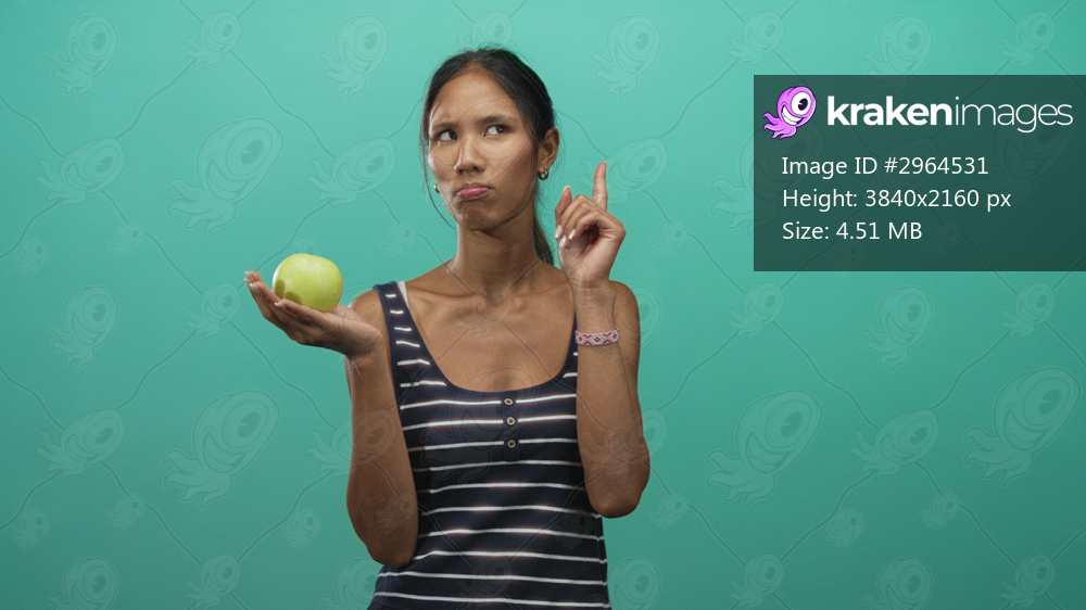 Thai woman in striped tank top holds green apple in palm, points finger and makes a skeptical face in studio; choice doubt contemplation.