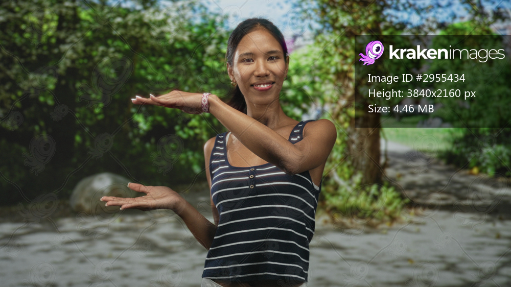 Thai woman in striped tanktop presents with palms apart showing size and hands mid gesture on a park pathway; friendly presentation.