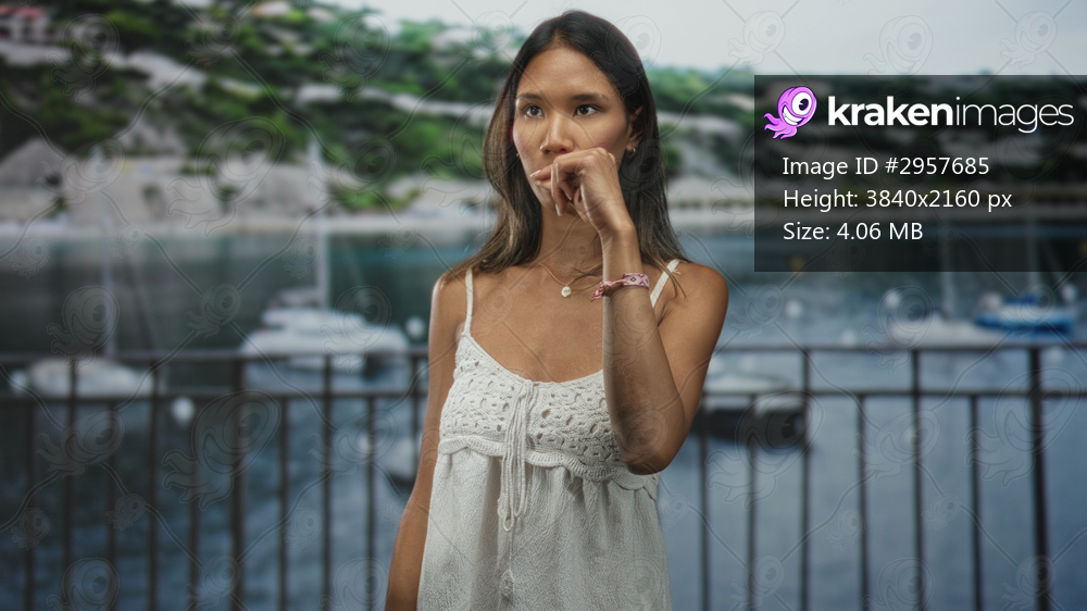 Thai woman in white dress pinching her cheek with fingers by marina railing and moored boats on a street; quiet thoughtfulness.