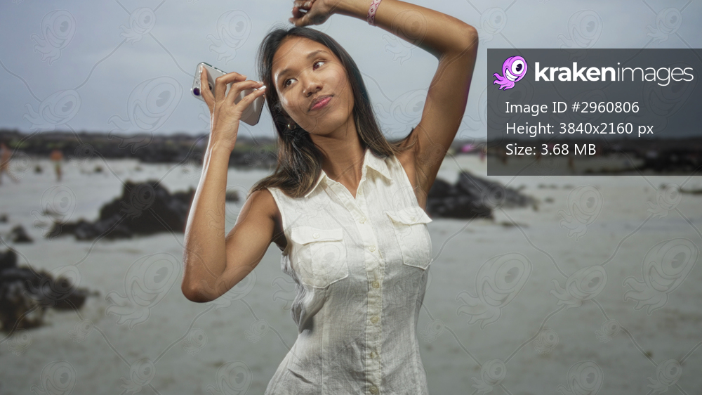 Thai woman in white sleeveless dress holds smartphone to ear while lifting arm to touch hair and smile in studio; joyful carefree.