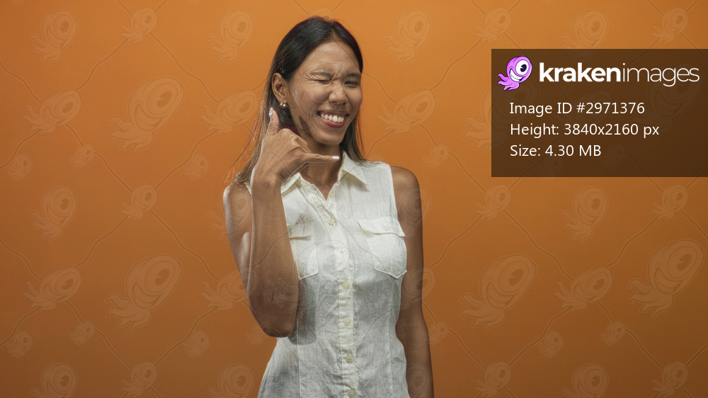 Thai woman in white sleeveless shirt smiling with eyes closed and showing a call me hand gesture near her ear, exposed forearm visible, photographed in studio; friendly joyful. - Kraken Images