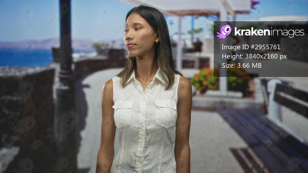 Thai woman in white sleeveless shirt standing, looking sideways at bench on a seaside street; serenity travel.