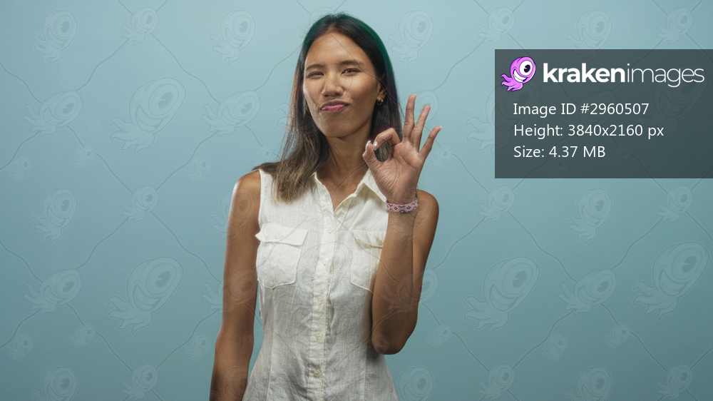 Thai woman making ok hand gesture and smiling in studio, wearing white sleeveless shirt and gold earrings; playful confidence.