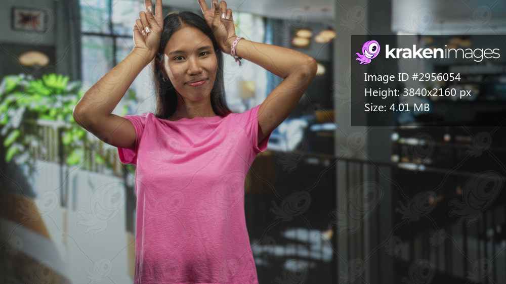 Thai woman making peace sign bunny ears with hands and smiling in a building cafe area wearing pink t shirt; playful joy.