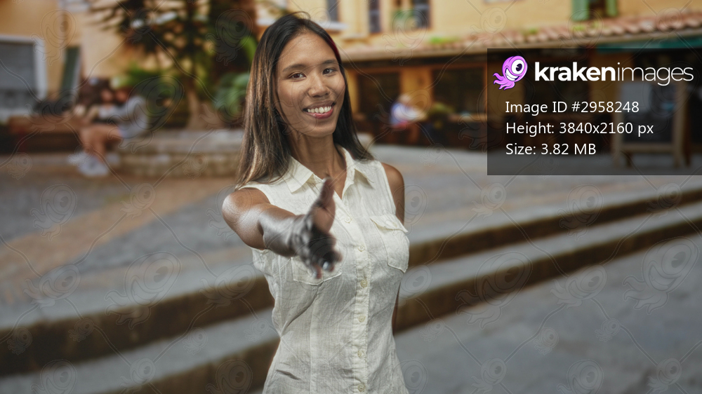 Thai woman offers right hand for handshake on a street by a cafe building, smiling and leaning forward; friendly welcome.