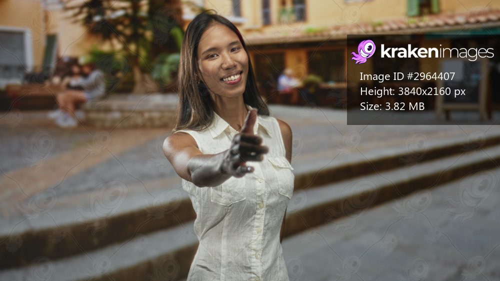 Thai woman offers right hand for handshake on a street by a cafe building, smiling and leaning forward; friendly welcome.