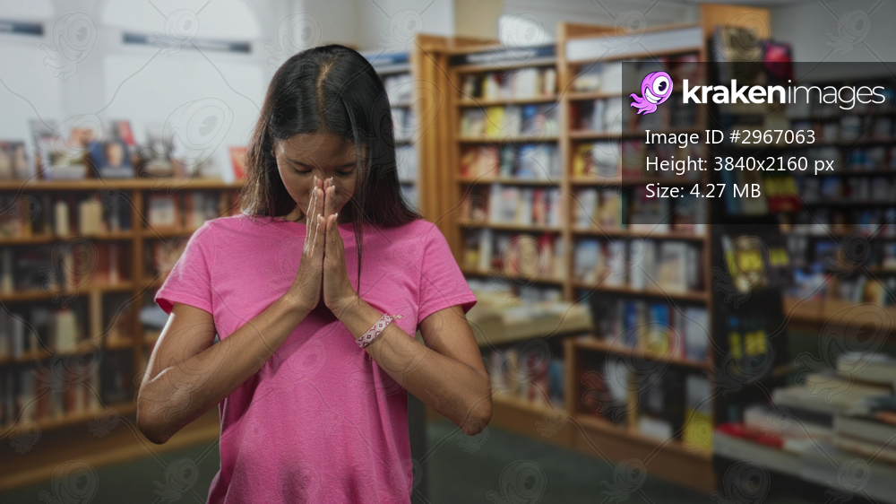 Thai woman with palms pressed together in prayer gesture in bookstore building wearing pink shirt and bracelet, head bowed in quiet posture; serene reflection. - Kraken Images