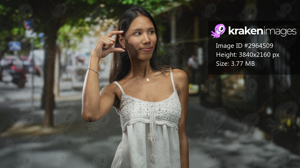 Thai woman pinching fingers near temple making a small size gesture, wearing white crochet dress and necklace on a city street with trees and scooters; thoughtful confidence. - Kraken Images