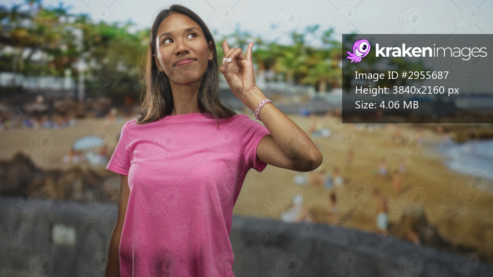 Thai woman with pink tshirt showing horns hand sign by a building promenade near a crowded beach and palm trees; summer vacation playful.