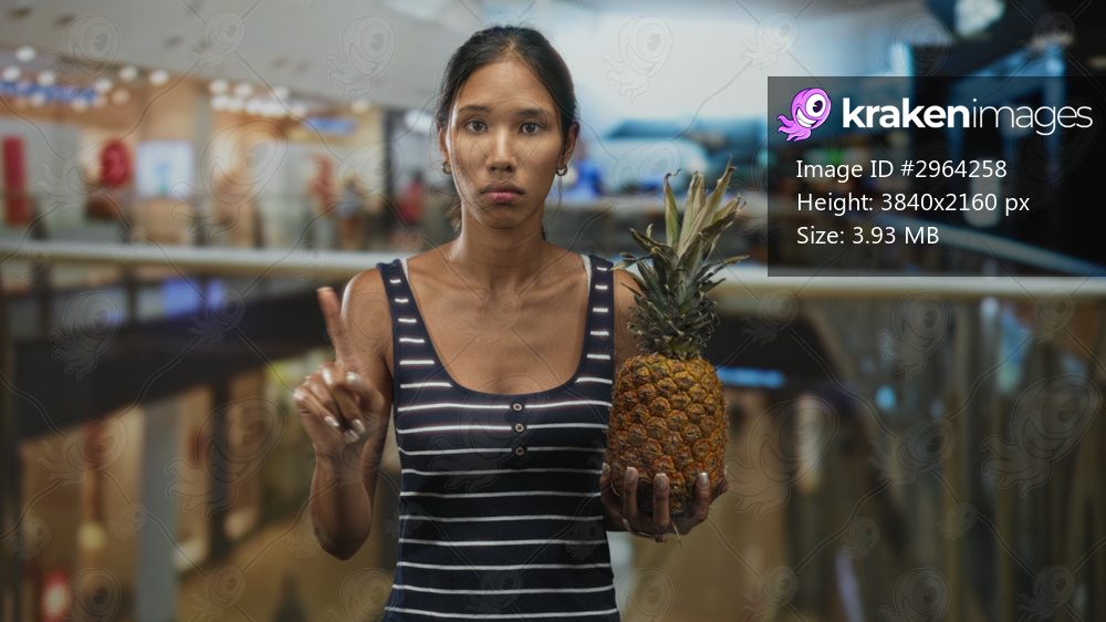 Thai woman pointing finger and holding a pineapple in a shopping building with direct gaze and posed stance; caution concentration.