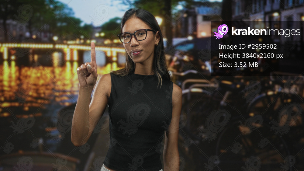 Thai woman pointing index finger with glasses by illuminated canal lights on a street at night; instructional confidence.