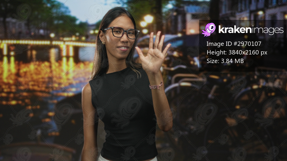 Thai woman pointing index finger with glasses by illuminated canal lights on a street at night; instructional confidence.