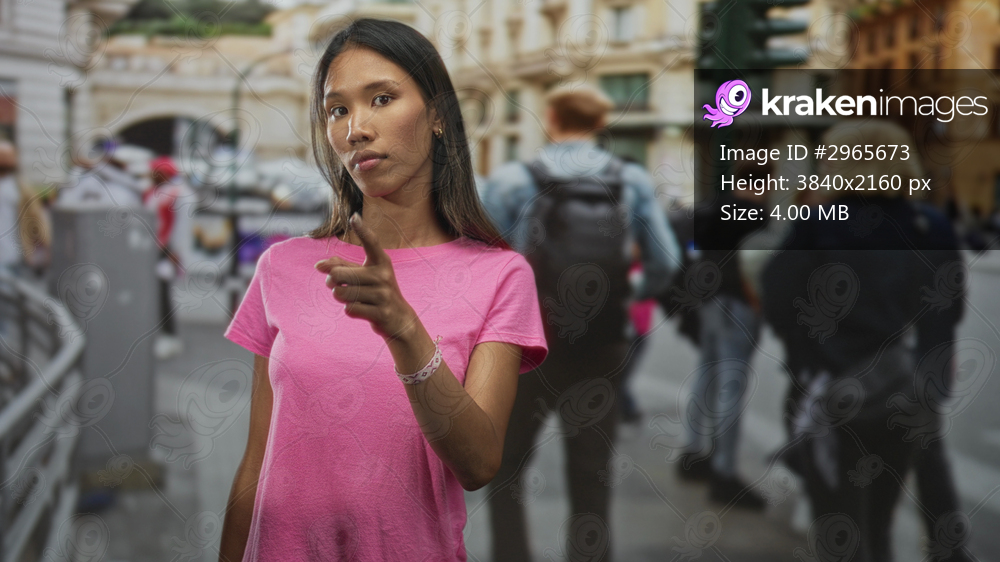 Thai woman points finger to camera on busy city street, wearing pink tshirt and bracelet, with pedestrians and traffic lights behind her; confidence.