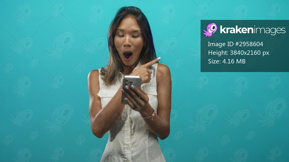 Thai woman points finger to her right while holding a smartphone, mouth open against a teal studio wall; surprise curiosity.