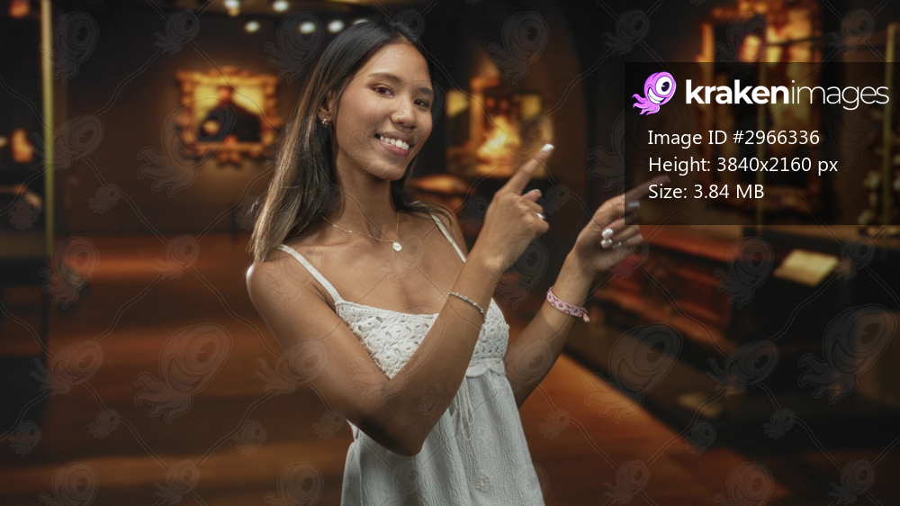 Thai woman points finger to painting in museum wearing white sundress and bracelets; curiosity discovery.