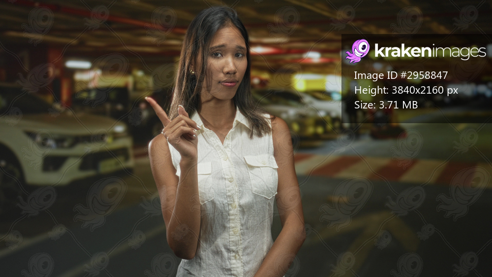 Thai woman points finger to terminal sign in airport near parked cars while wearing a white sleeveless shirt; calm confidence.