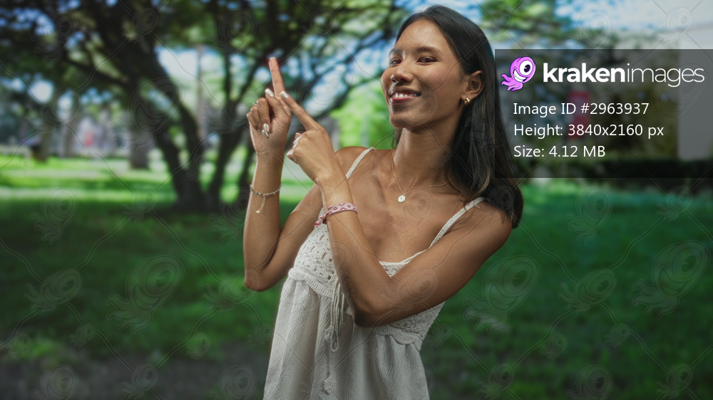 Thai woman points index fingers upward while smiling, wearing a white sundress among trees and grass in a forest; playful confidence.