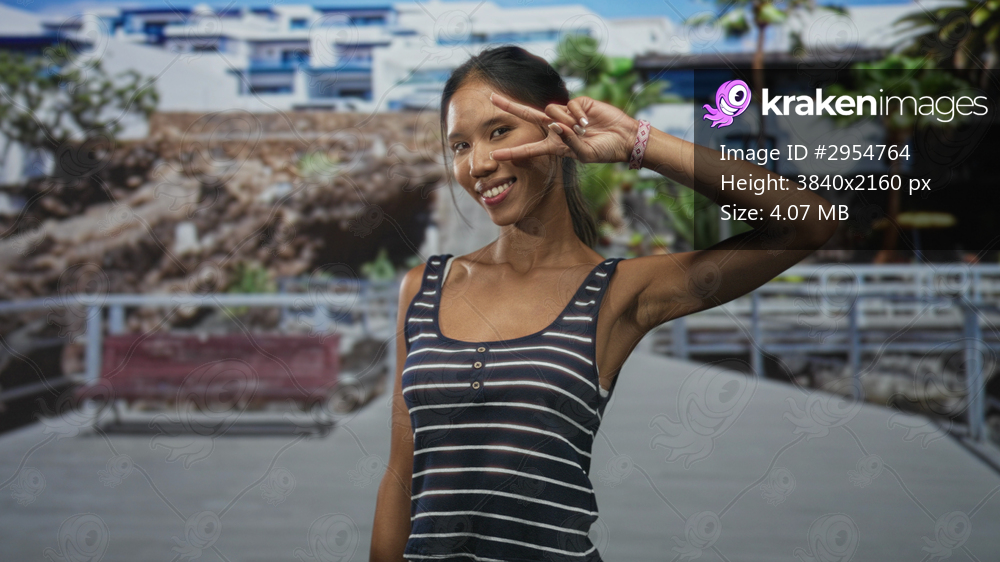 Thai woman posing and making a peace sign with hand by her face, smiling in a striped tank top on a street pier; playful confidence.