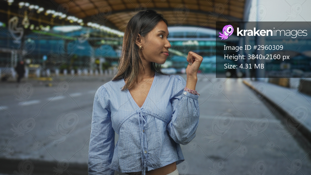 Thai woman raising a clenched hand to her face, eyes closed, wearing a blue buttoned blouse while standing at an airport terminal curb near arrivals; serenity. - Kraken Images