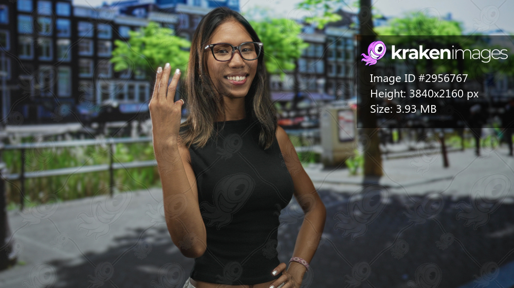 Thai woman raising middle finger with hand visible on a city street by a canal and buildings, wearing glasses and black sleeveless top; defiance attitude. - Kraken Images