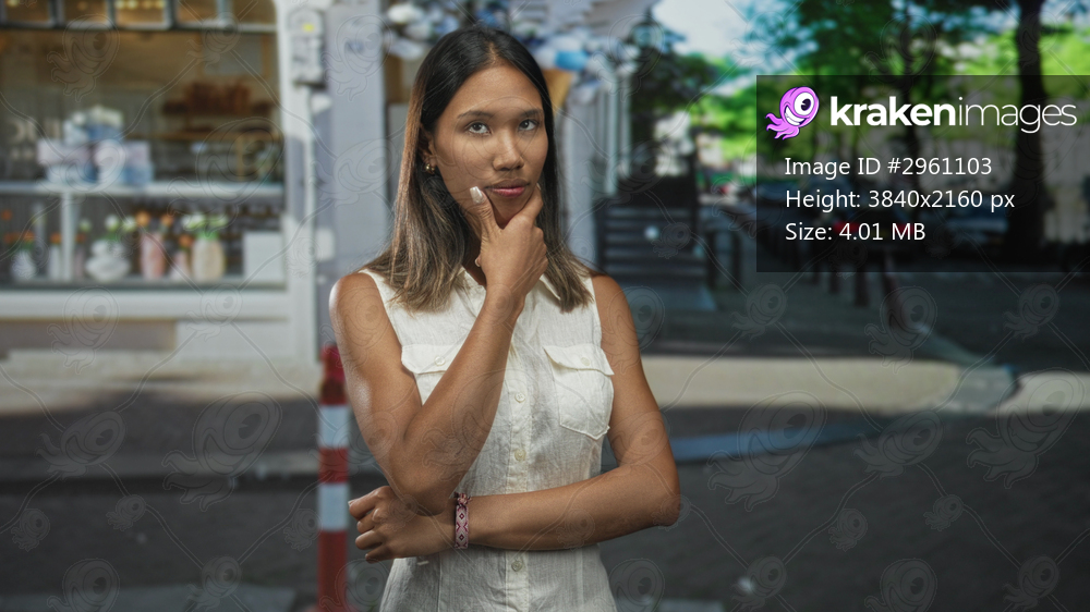 Thai woman resting hand on chin and crossed arm by a shop storefront on a city street; quiet contemplation.