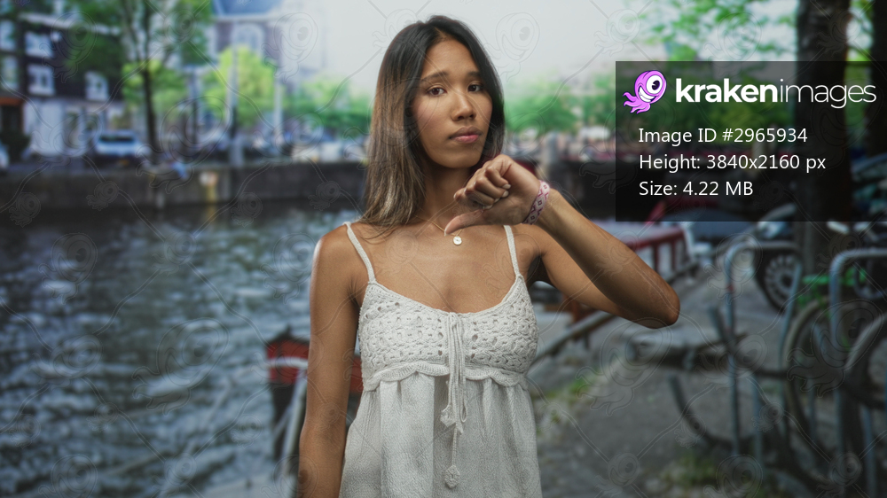 Thai woman showing thumbs down with bare hand and pendant necklace by a canal street walkway; disappointment.
