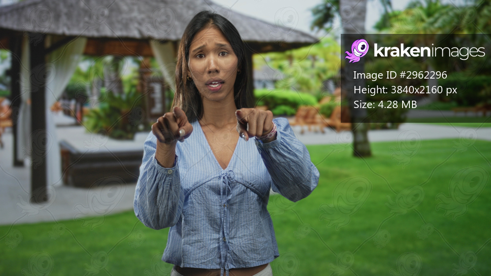 Thai woman smiles and holds hands forward showing fingernails and rings, wearing blue blouse in resort gazebo by palm trees; serenity self care.