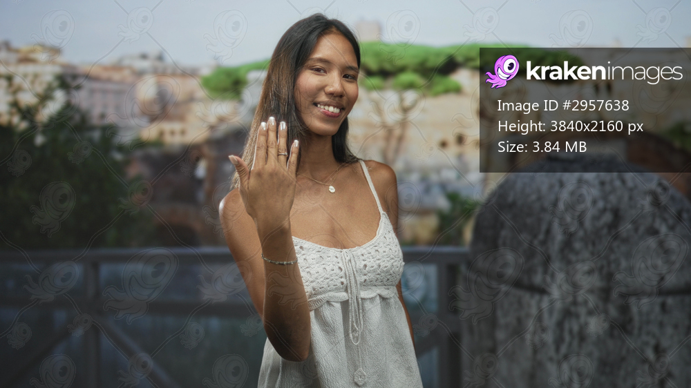 Thai woman smiles and points both index fingers at camera while showing a ring on her left hand at building terrace; confidence travel.