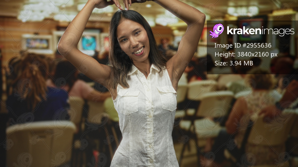 Thai woman smiling with arms raised above head wearing white sleeveless shirt in building lecture hall with seated audience; joy celebration.
