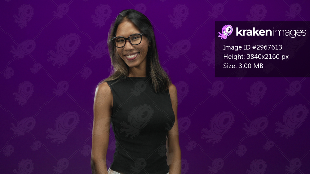 Thai woman smiling with glasses and a head tilt, wearing a black sleeveless top while standing against a purple studio backdrop; confidence connection. - Kraken Images
