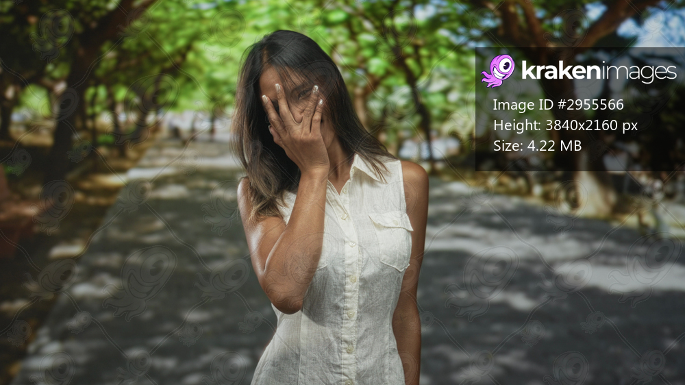 Thai woman smiling, hand touching face, wearing sleeveless white top on a tree lined street with dappled sunlight; serenity.