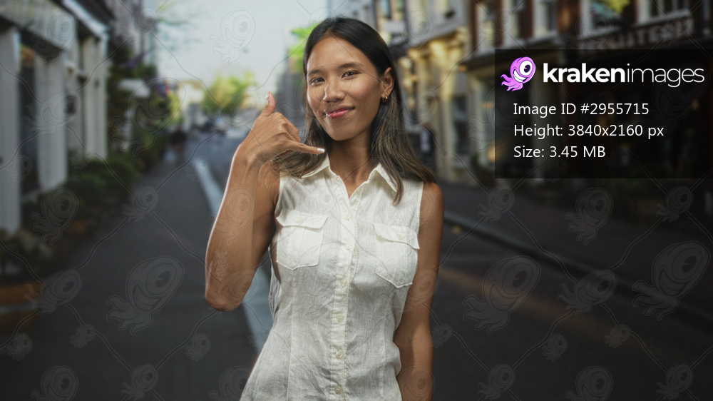 Thai woman smiling makes call me hand gesture with her hand at ear on a cobblestone street, wearing white sleeveless shirt and showing bare hand; friendly invitation. - Kraken Images