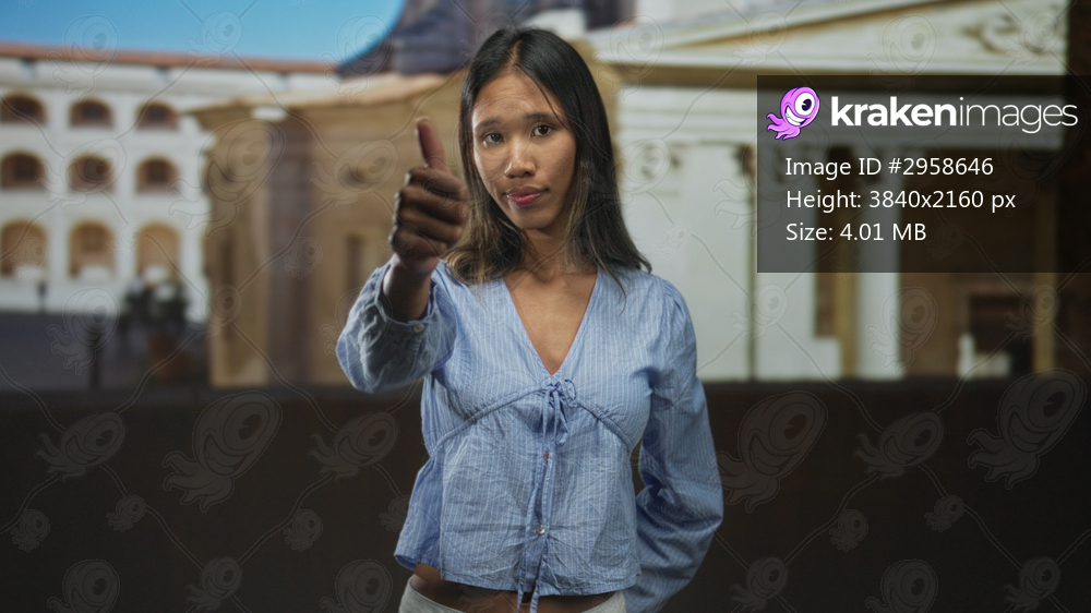 Thai woman smiling shows thumbs up with outstretched hand toward camera in front of a neoclassical columned building, wearing a light blue blouse; confidence positivity. - Kraken Images
