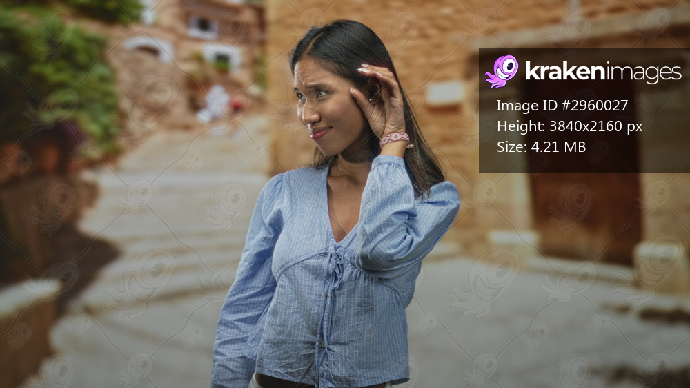 Thai woman with soft smile tucks hair behind ear, tilts head and raises hand near face while wearing a blue blouse in a studio; serene travel daydream. - Kraken Images