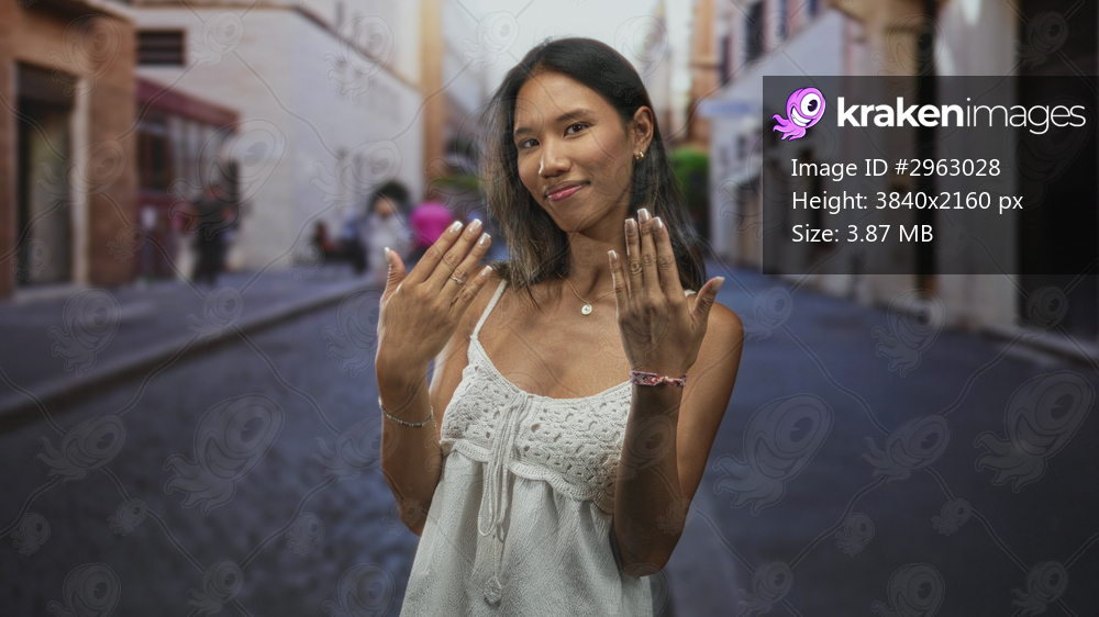 Thai woman southeast asian brunette in white dress showing hands and gesturing on cobbled street; welcoming invitation.