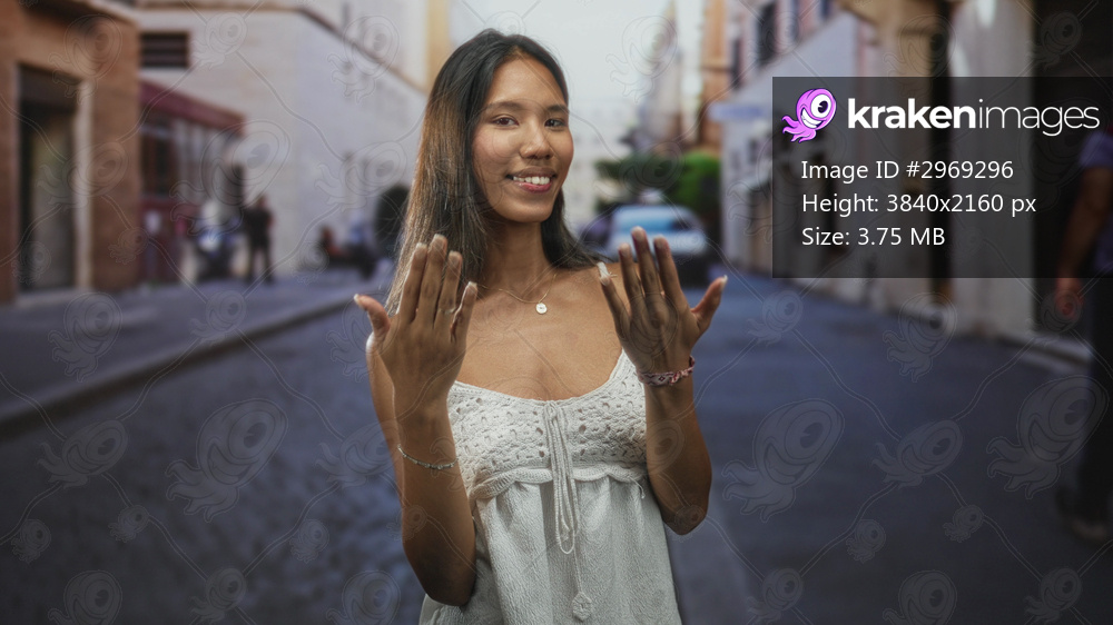 Thai woman southeast asian brunette in white dress showing hands and gesturing on cobbled street; welcoming invitation.