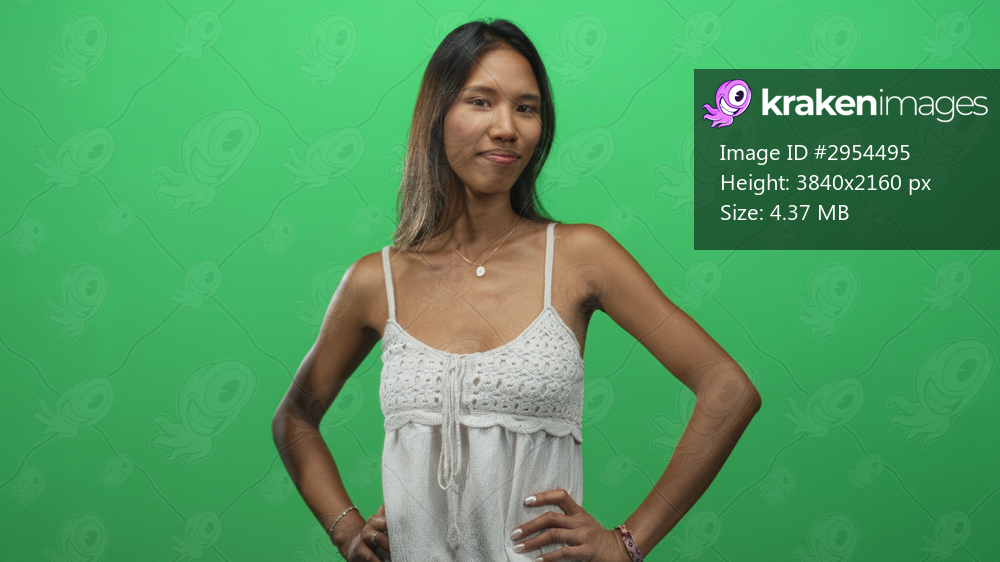 Thai woman standing with hands on hips wearing white crocheted tank top and pendant necklace against a studio green screen, slight smile and head tilt; confidence poise. - Kraken Images